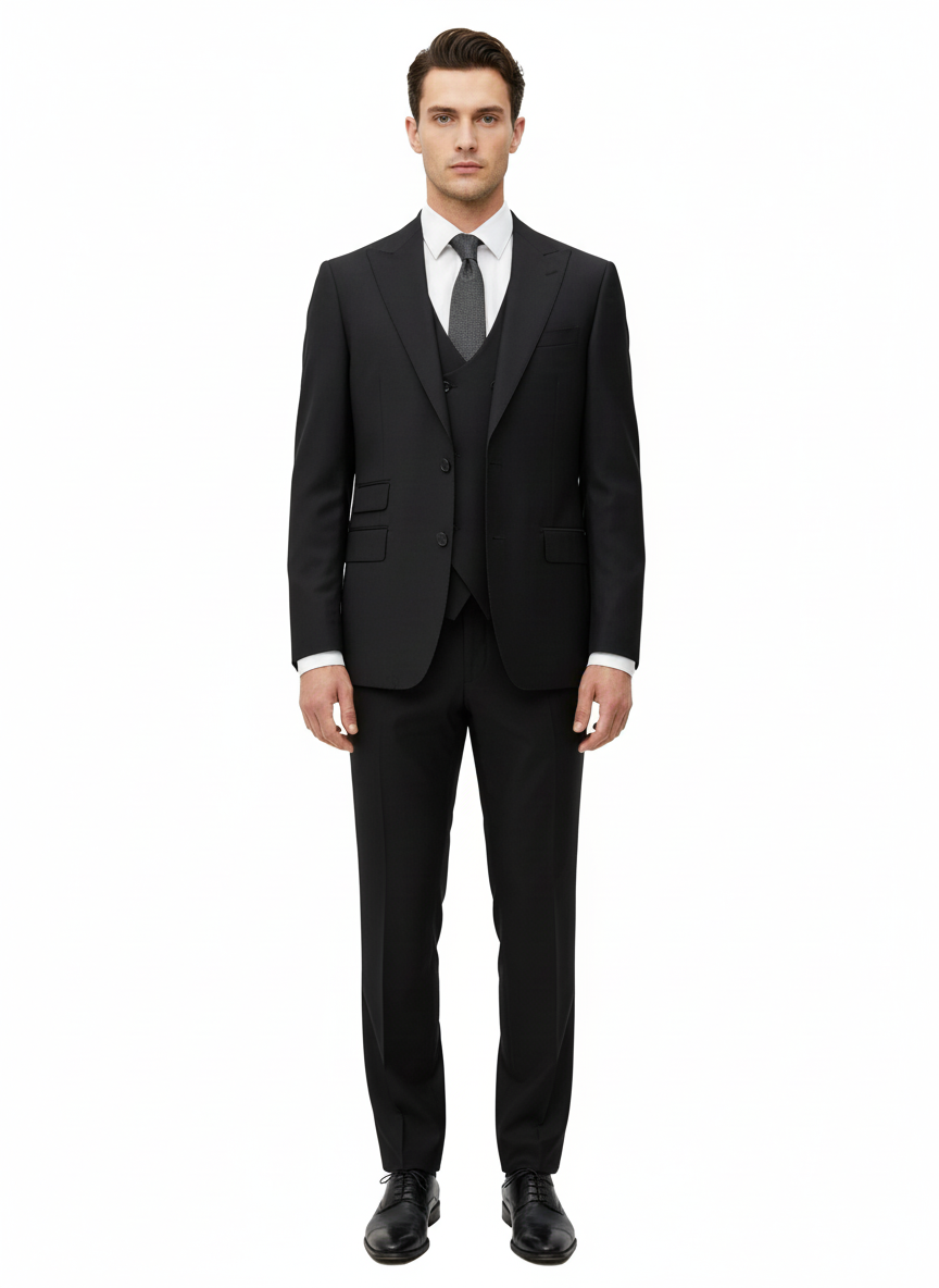 Prosecco suit & vest models comprise of wide peak lapel jacket, a double breasted vest, and flat front modern fit pants.