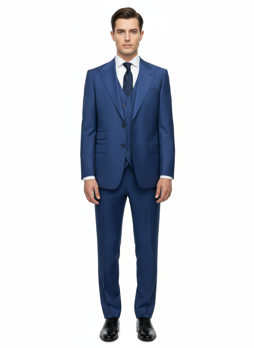 Prosecco suit & vest models comprise of wide peak lapel jacket, a double breasted vest, and flat front modern fit pants.